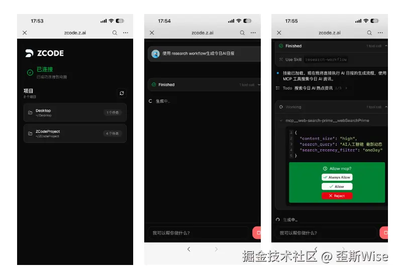 这段话看得我特别高兴,赶紧就去测试了Z Code,用手机指挥AI开发,是卷王的梦想,毕竟在服务器上开发,坦白来说太累了!