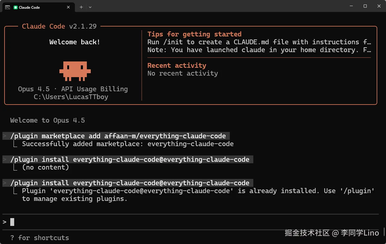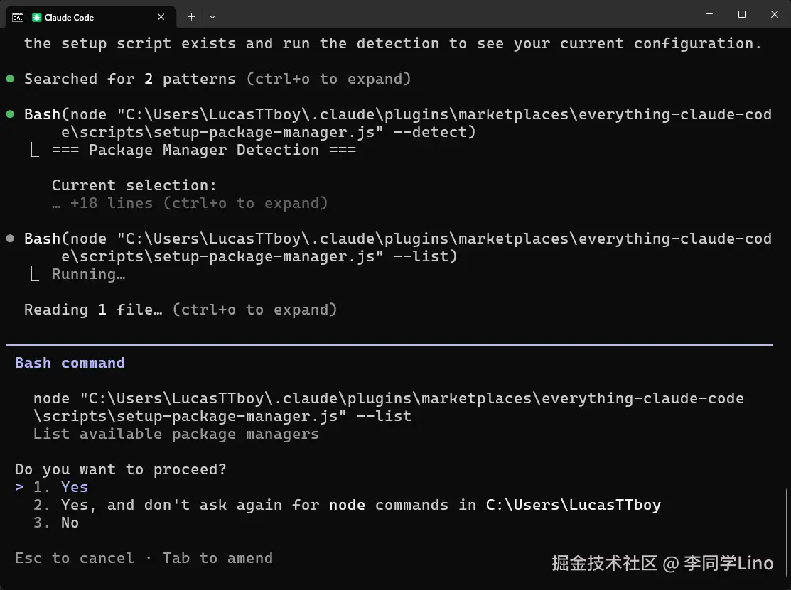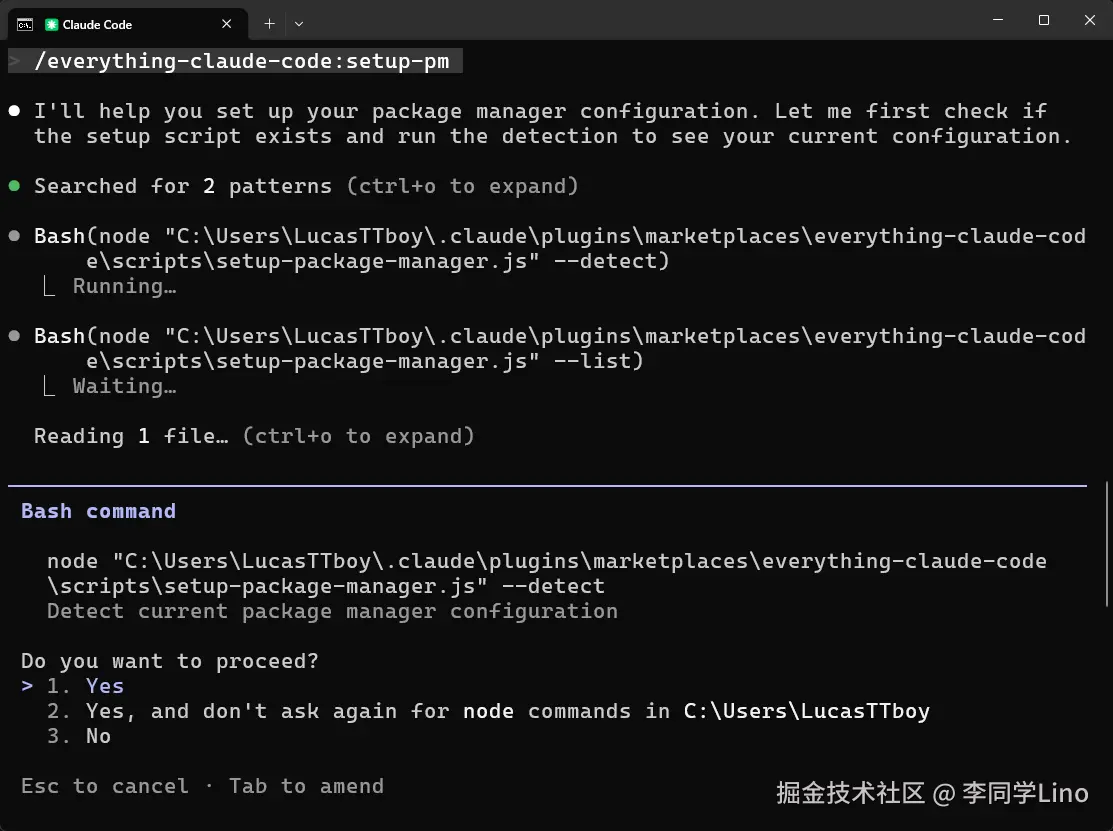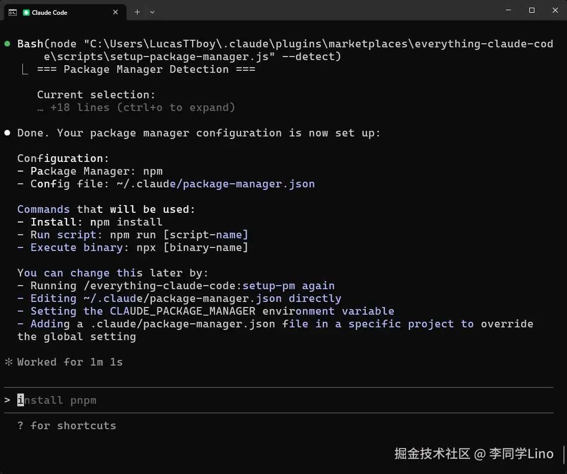 运行初始化命令: 在对话框输入以下命令(Claude 可能会自动补全成长得像 everything-claude-code:setup-pm 的样子,不用管,直接回车):