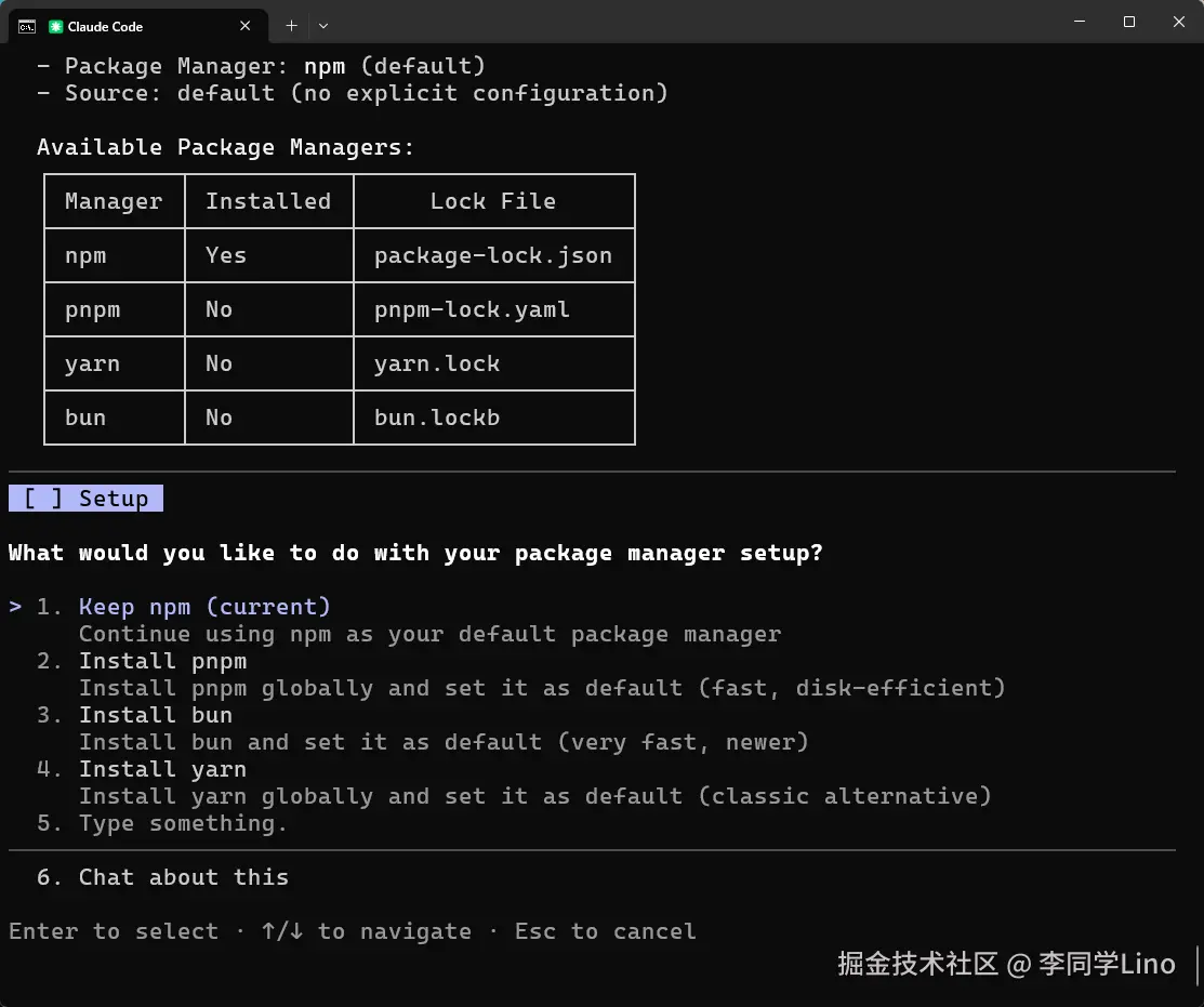 pnpm或bun,可以选对应的选项,Claude 会帮你去安装它。