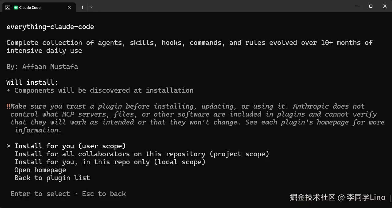 输入安装命令并回车后,终端会出现一个交互式的选择界面(如下图所示)。这时候不要慌,这里需要你决定“把这些能力装在哪里”。