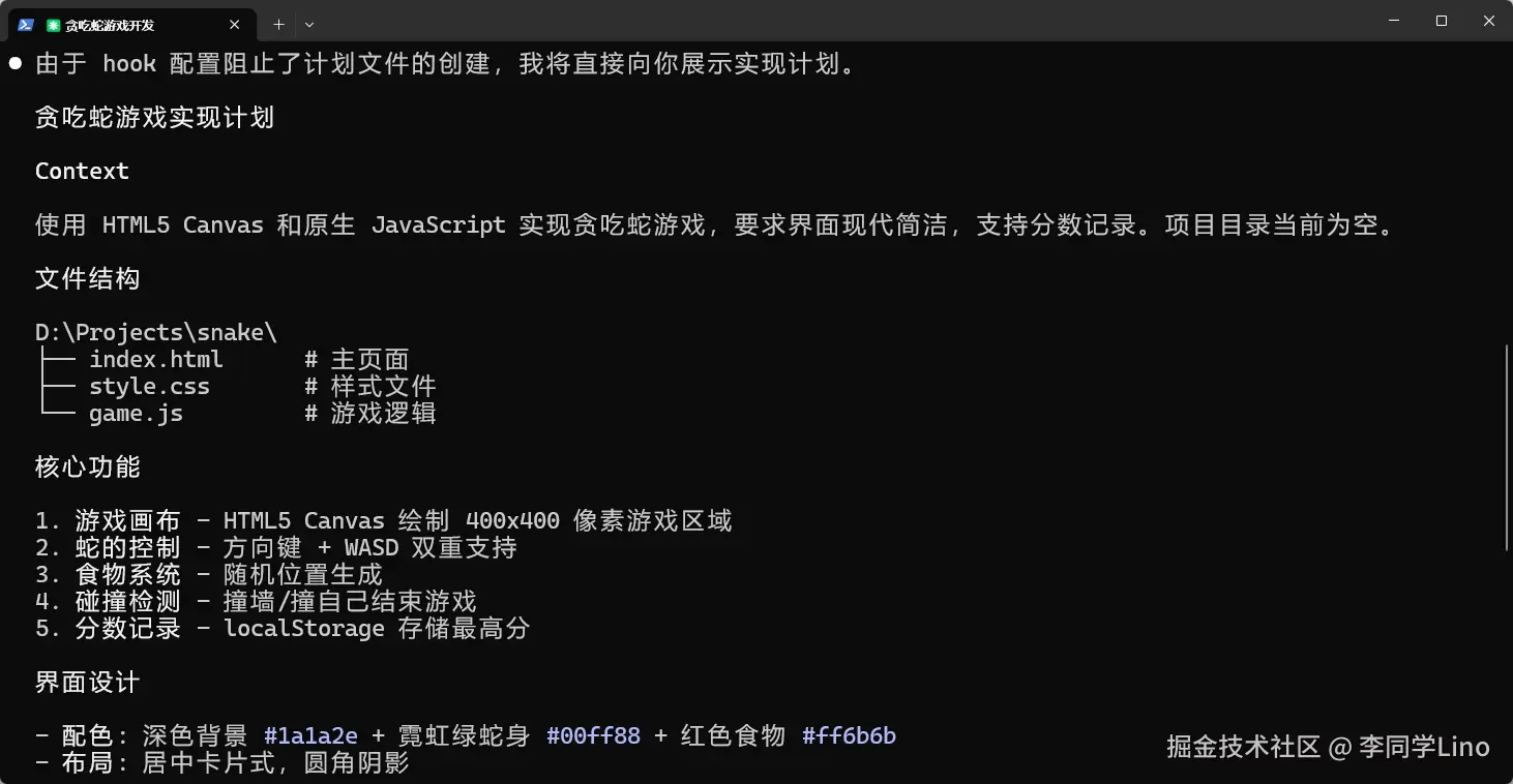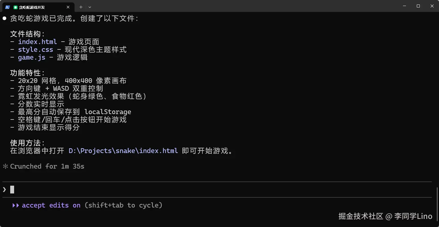 当你授权后,你会看到屏幕上代码飞速滚动。几秒钟后,Claude 会告诉你所有文件都创建完毕。 这时候,你可以直接去你的项目文件夹里打开 index.html,一个只有 20KB 大小、界面现代、手感丝滑的贪吃蛇游戏就已经躺在那里了。