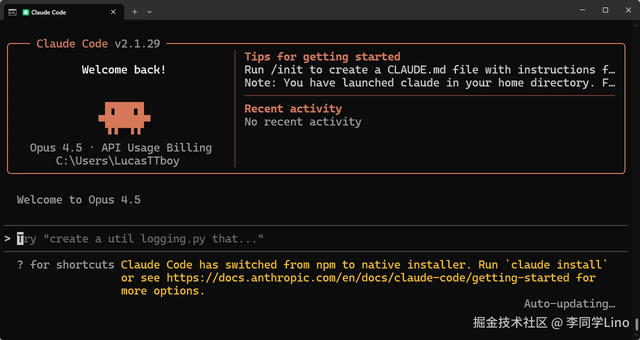 打开你的终端(Terminal 或 PowerShell),不需要下载任何 ZIP 包,直接在终端里和 Claude 对话即可。 启动 Claude Code: