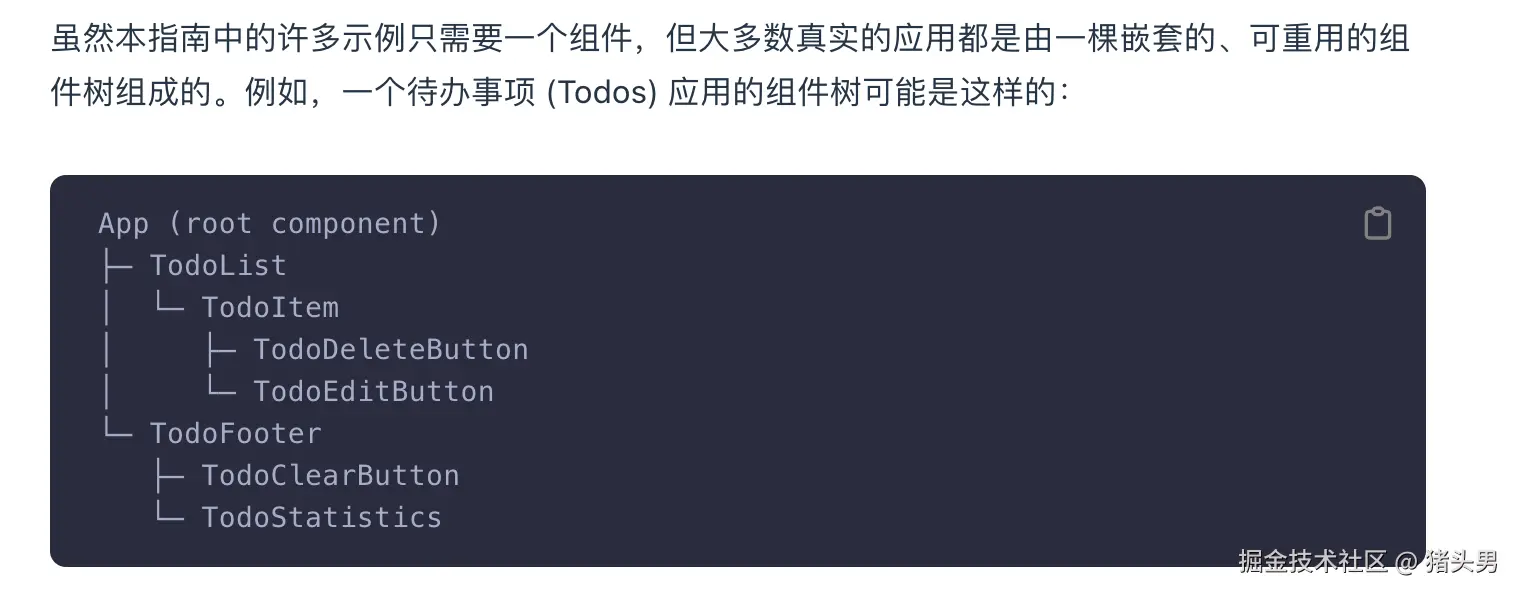 - 由上图Vue官方文档所示一个App组件有TodoList和TodoFooter两个子组件,这两个子组件又有子组件,这就是组件树了