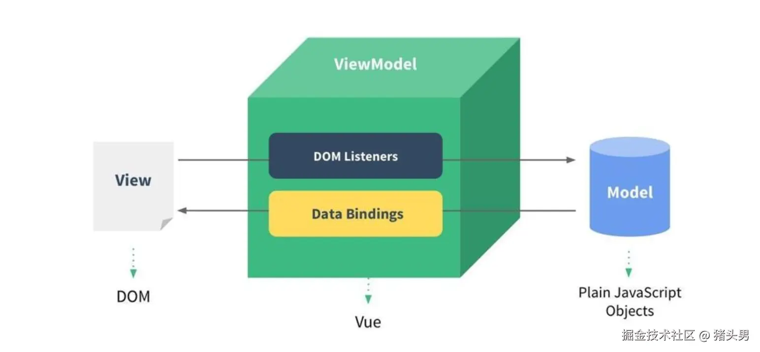 Model和View并无直接关联,而是通过ViewModel来进行联系的,Model和ViewModel之间有着双向数据绑定的联系。因此当Model中的数据改变时会触发View层的刷新,View中由于用户交互操作而改变的数据也会在Model中同步。