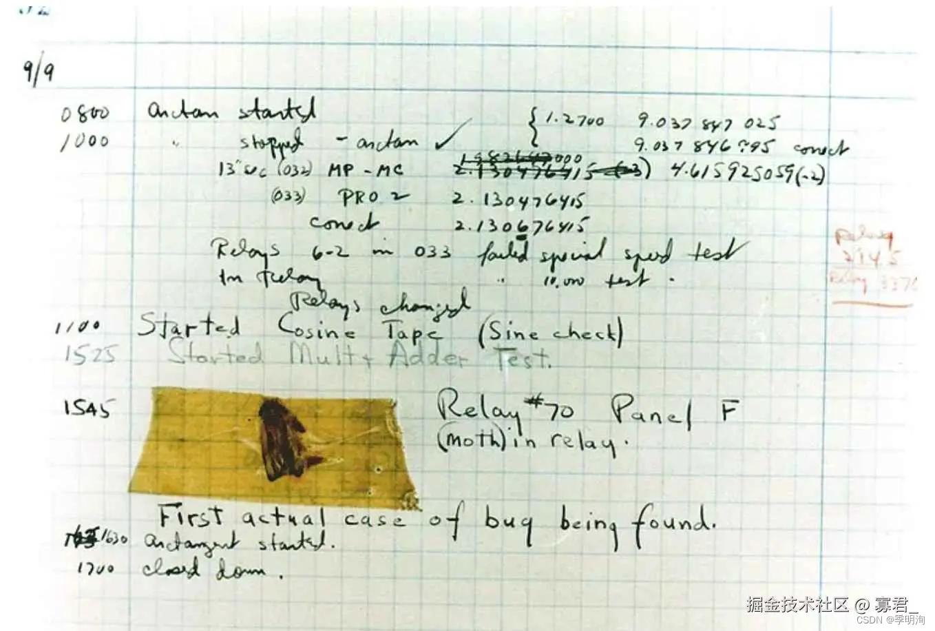 “Bug”的创始人格蕾丝·赫柏(Grace Murray Hopper),她是一位为美国海军工作的电脑专家,1947年9月9日,格蕾丝·赫柏对Harvard Mark II设置好17000个继电器进行编程后,技术人员正在进行整机运行时,它突然停止了工作。于是他们爬上去找原因,发现这台巨大的计算机内部一组继电器的触点之间有一只飞蛾,这显然是由于飞蛾受光和热的吸引,飞到了触点上,然后被高电压击死。所以在报告中,赫柏用胶条贴上飞蛾,并把“bug”来表示“一个在电脑程序里的错误”,“Bug”这个说法一直沿用到今天。