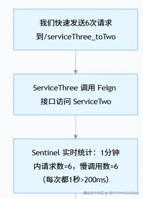 关键逻辑:Sentinel 会在 “统计时长” 内累计 “请求数” 和 “慢调用数”,只有两个条件同时满足(请求数≥最小请求数、比例≥阈值),才会触发熔断 —— 这是为了避免 “少量慢请求” 误判为服务故障。
