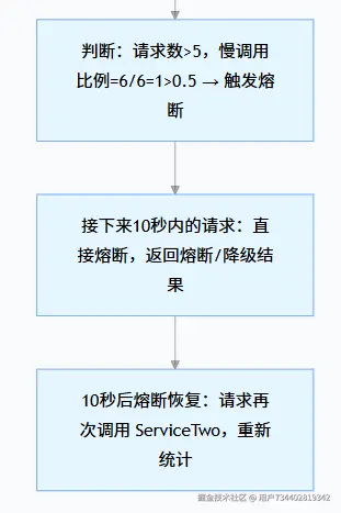 我们要实现:1 分钟内(60000ms),如果调用 ServiceTwo 的请求超过 5 次(最小请求数),且其中 50% 以上的请求响应时间超过 200ms(慢调用 RT),则熔断 10 秒。