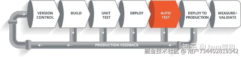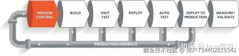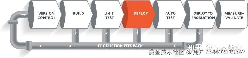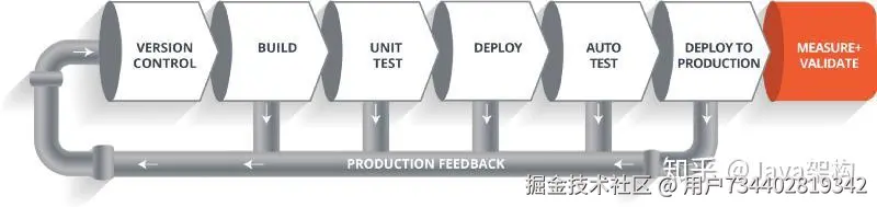 因此,整个生命周期将会继续迭代下去,直到我们得到可以直接部署到生产环境中的代码或者产品。除此之外,在生产环境中我们还需要对代码进行度量和验证,以实时监控应用的线上运行状态。