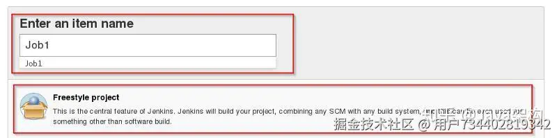 第 3 步:选择 “freestyle project” 并填写项目的名称(如下以 “Job1” 为例),并点击 OK 确认。