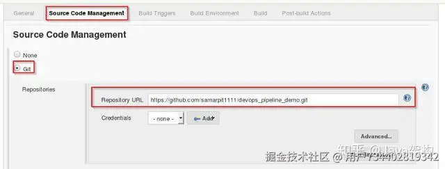 第 9 步:选择 “Source Code Management”(源代码管理),并提供一个 Git 仓库地址。然后再点击 “Apply” 和 “Save” 按钮确认。