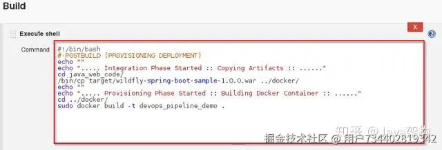 第 11 步:输入 shell 命令。如下示例脚本将会开始代码的集成阶段,并构建出 Docker 容器。