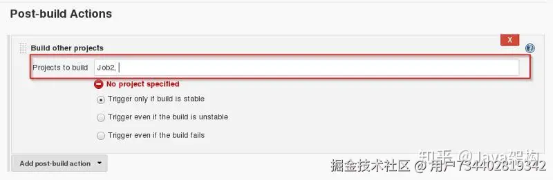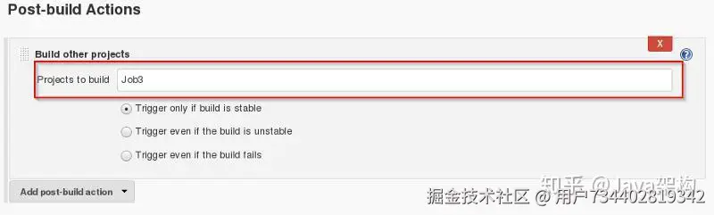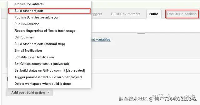 第 18 步:点击 Post-build Actions 选项,并在下面的菜单中选择 Build other projects。
