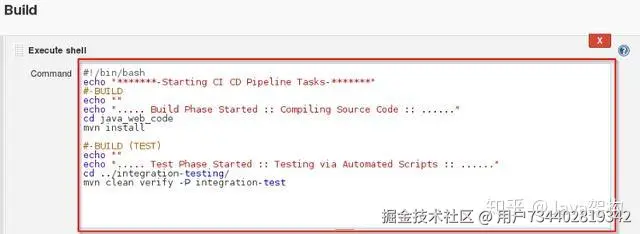 第 6 步:输入 shell 命令。如下示例脚本会构建已归档的文件,并得到 war 格式的文件。在此之后,它将会拉取最新的代码,然后,采用 maven 安装所依赖的包。因此,在这个步骤中只是简单的安装了依赖并对应用程序进行了编译。