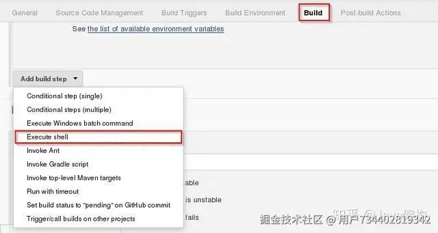 第 10 步:点击 “Build” 选项,并在下面的菜单中选择 “Select Execute Shell”。