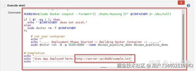 第 16 步:输入 shell 命令。如下示例将会检查 Docker 容器文件,并将它部署在 8180 端口上。点击 Save 按钮保存。