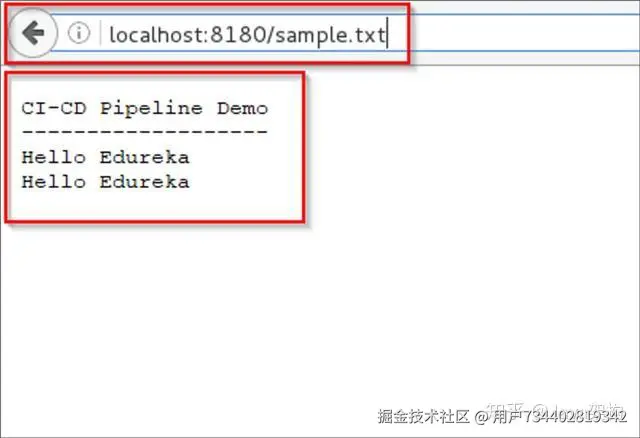 第 27 步:在流水线成功运行完成之后,我们可以在浏览器中打开 localhost:8180/sample.text 进行验证。此时该应用程序已处于运行状态,并且浏览器中会显示出此文本文件的具体内容。