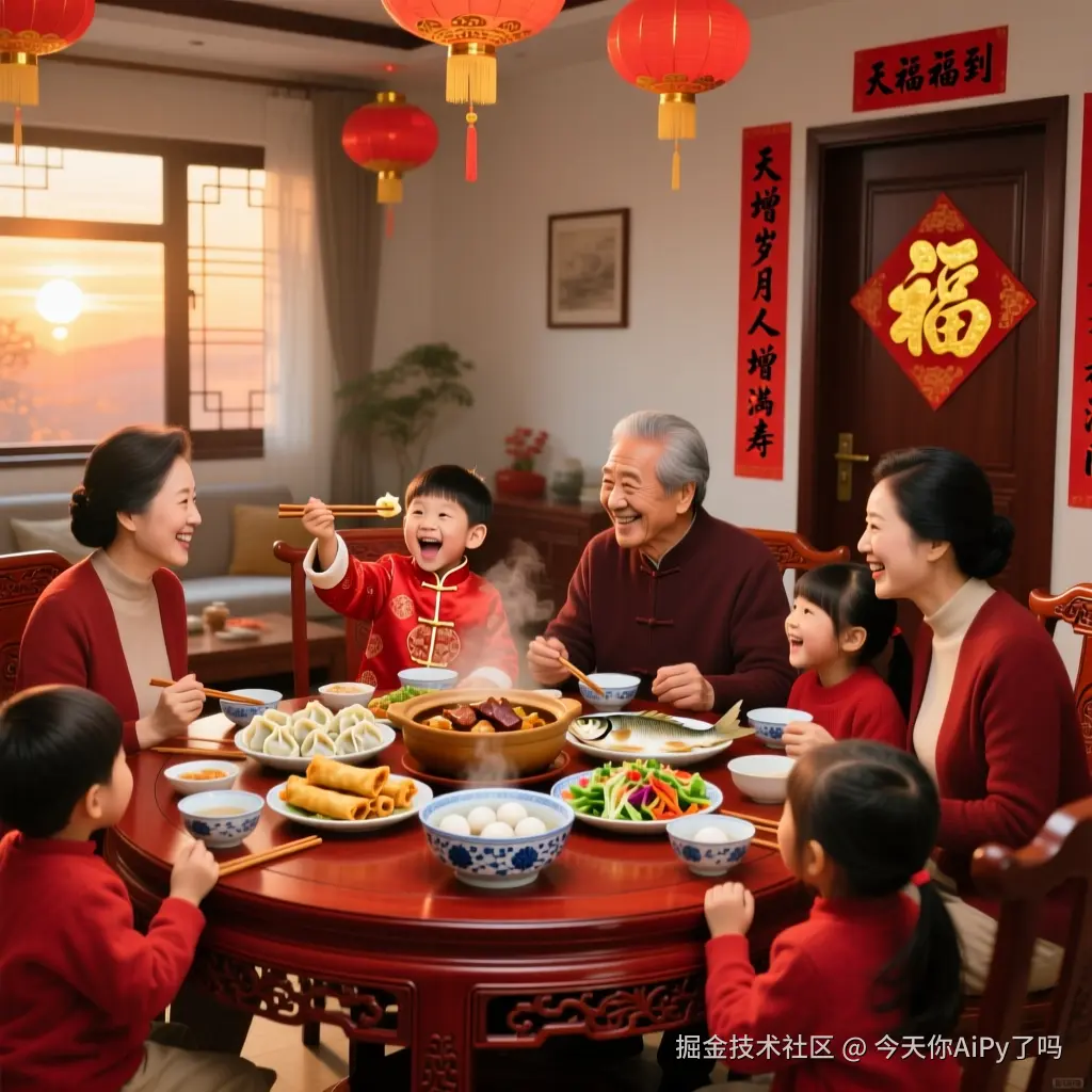 - 温馨马年家庭团聚场景(全家人围坐吃年夜饭)