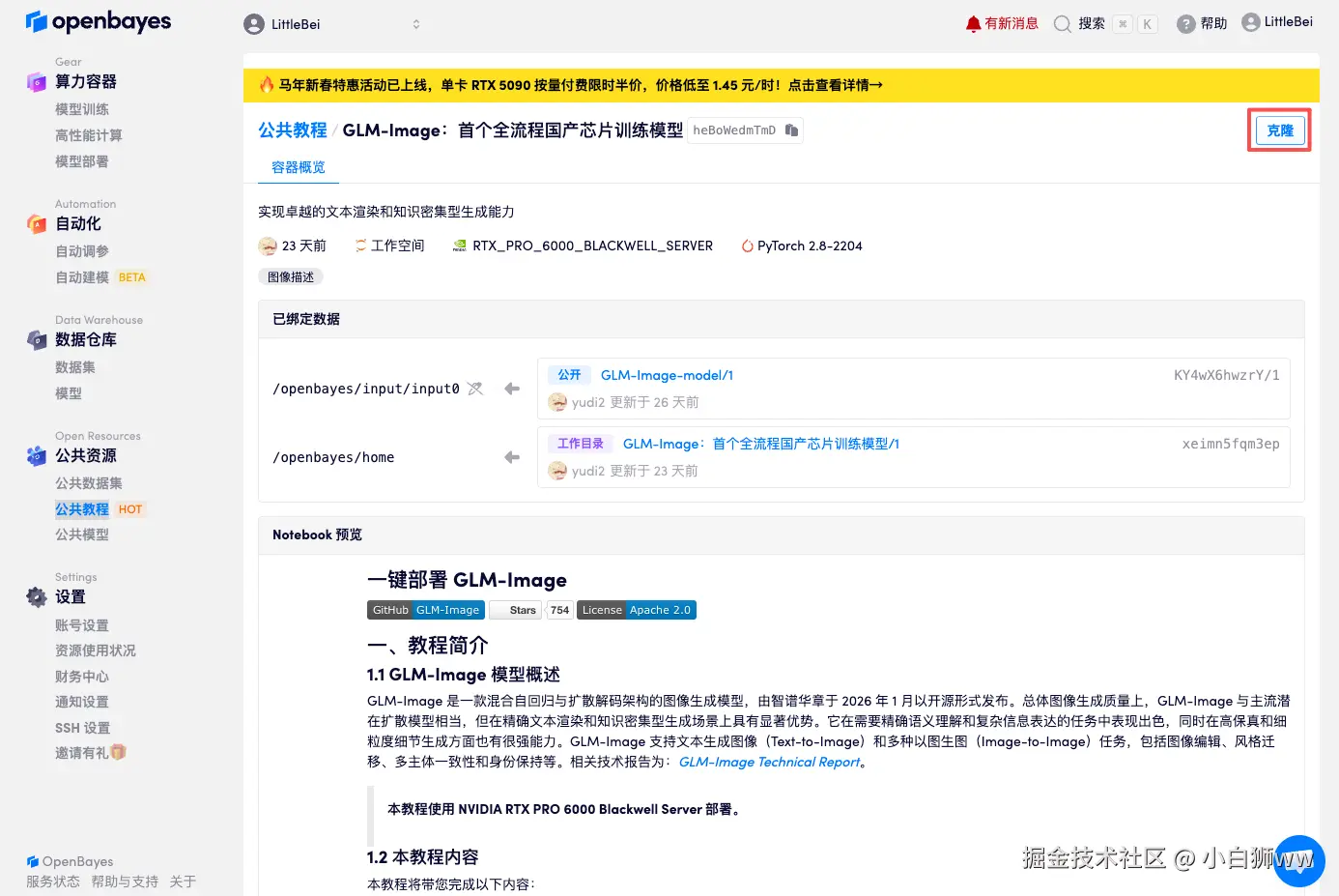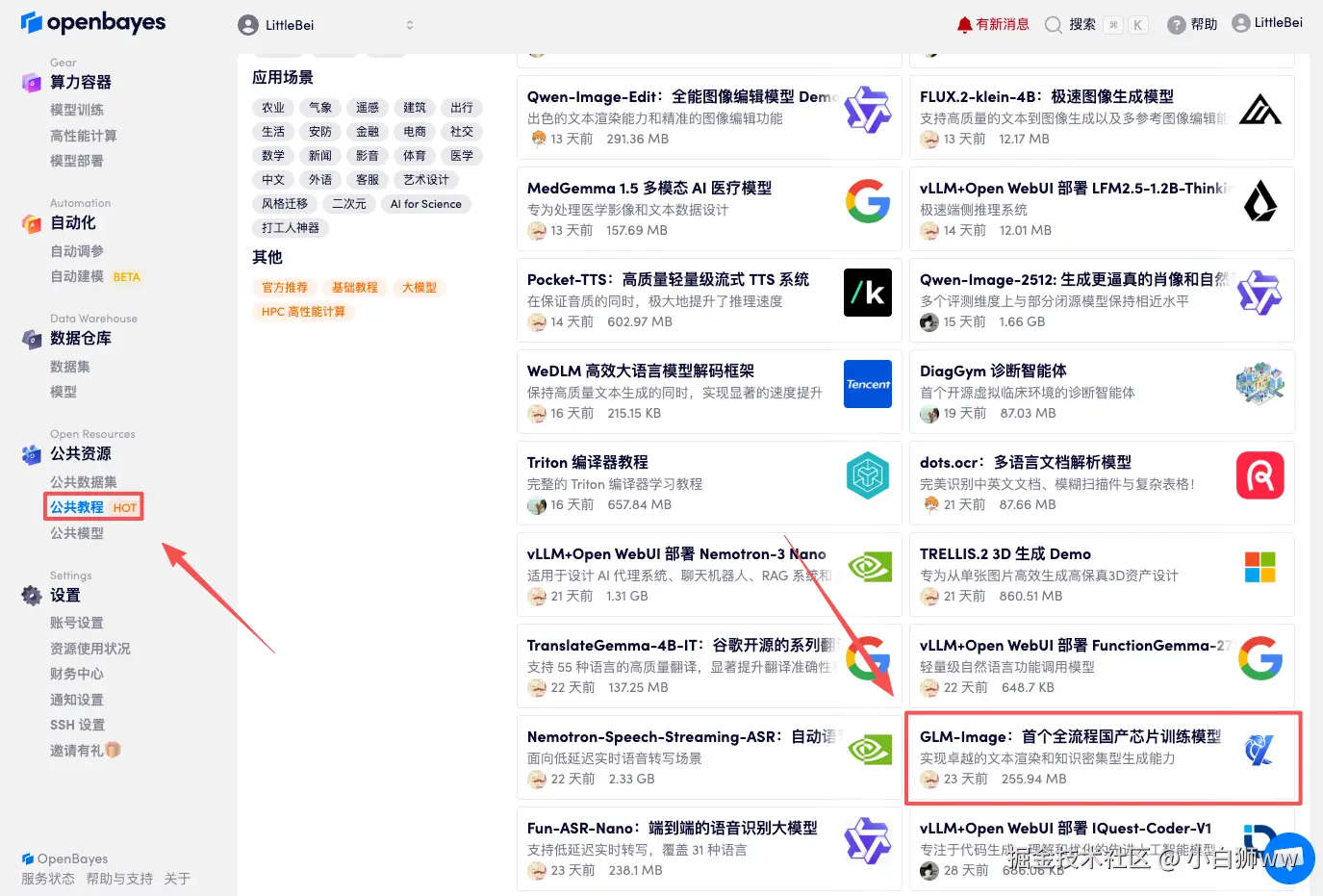 首先点击「公共教程」,找到「GLM-Image:首个全流程国产芯片训练模型」,单击打开。