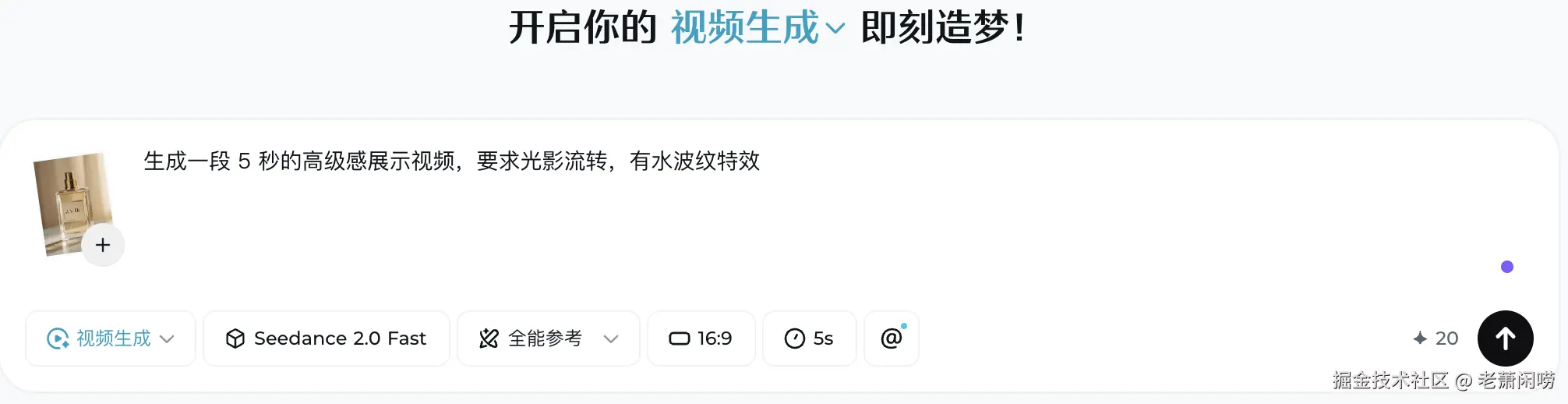 - 需求:将一张静态的香水图片,生成一段 5 秒的高级感展示视频,要求光影流转,有水波纹特效。
