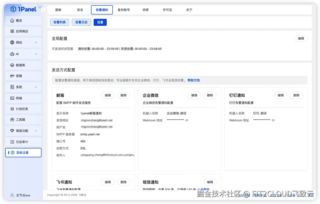 在v2.1.0版本中,1Panel在“面板设置”模块中新增了企业微信、钉钉和飞书的告警支持。通过扩展告警通知渠道,用户可以根据团队的协作习惯灵活选择告警消息的触达方式,在异常发生时及时接收通知并响应处理,进一步提升告警的联动效率与运维响应速度。