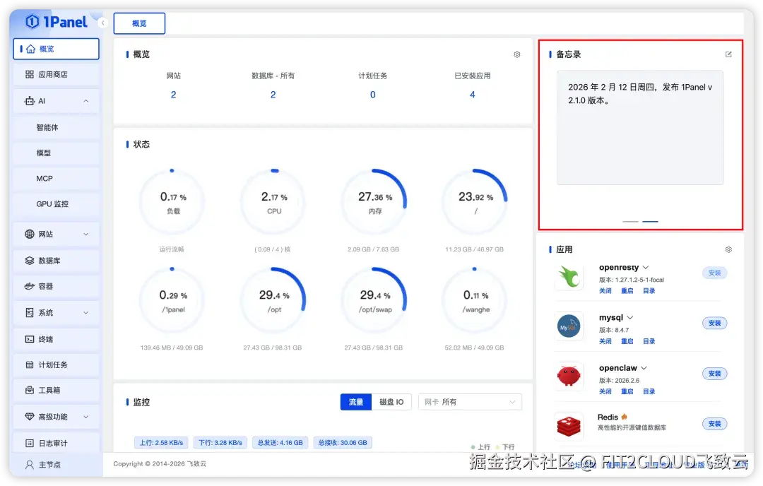 1Panel v2.1.0版本在“概览”页面新增了备忘录功能。用户可以直接在面板内记录重要事项、变更说明与运维备注,减少信息分散带来的沟通成本。通过备忘录,团队成员可以更快速地了解当前环境的关键状态与处理背景,便于后续维护与协作交接。