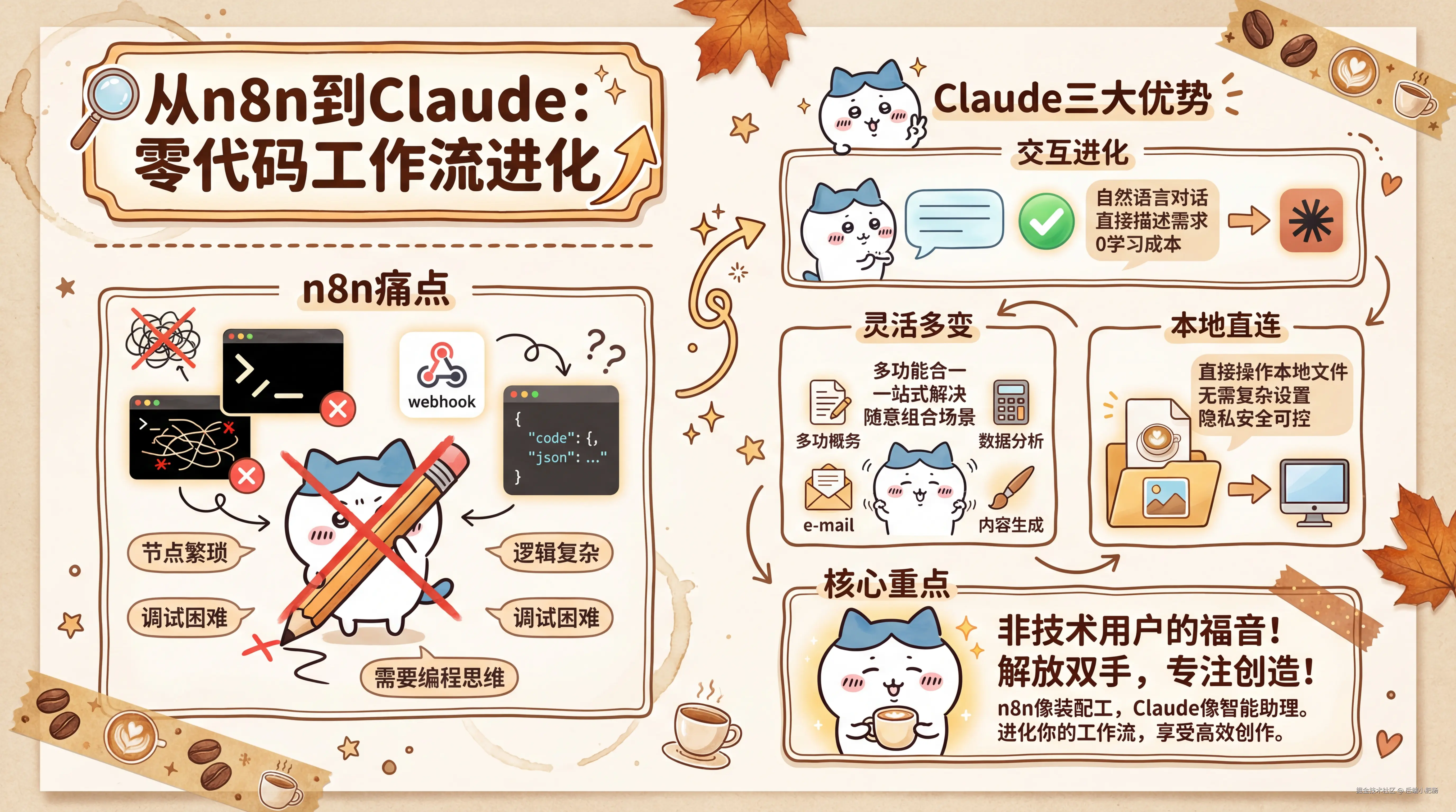 n8n 虽然强大,但对非技术人员来说,理解 Webhook、JSON 数据结构以及排查报错简直是噩梦。转投 Claude Skills 主要基于三个降维打击的优势: