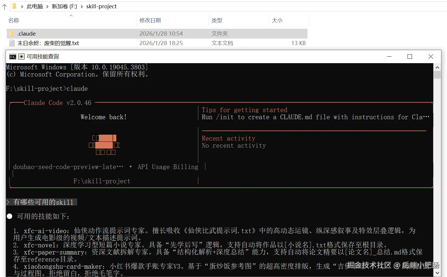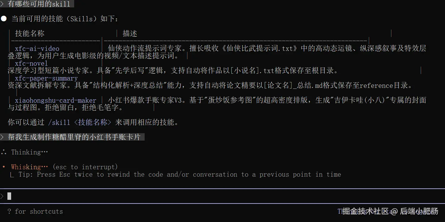 回到.claude上级目录,在文件路径处输入cmd打开命令提示符,输入claude进入claude code,再输入有哪些可用的skill,可以看到下图中,生成小红书手账卡片的skill已经被成功添加。