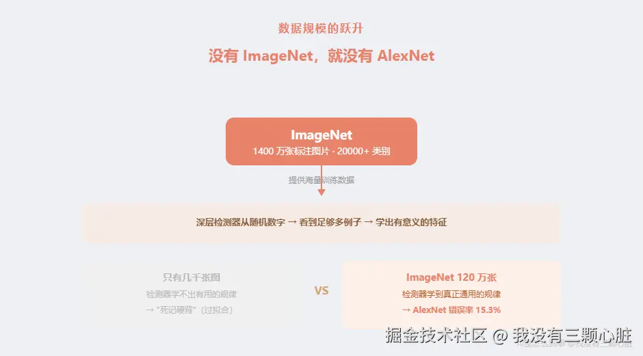 没有 ImageNet,就没有 AlexNet 的突破。 那些深层的检测器需要看到足够多的例子,才能从随机数字变成有意义的特征提取器。只有几千张图,网络根本学不出来。