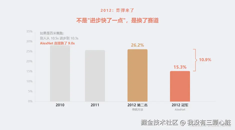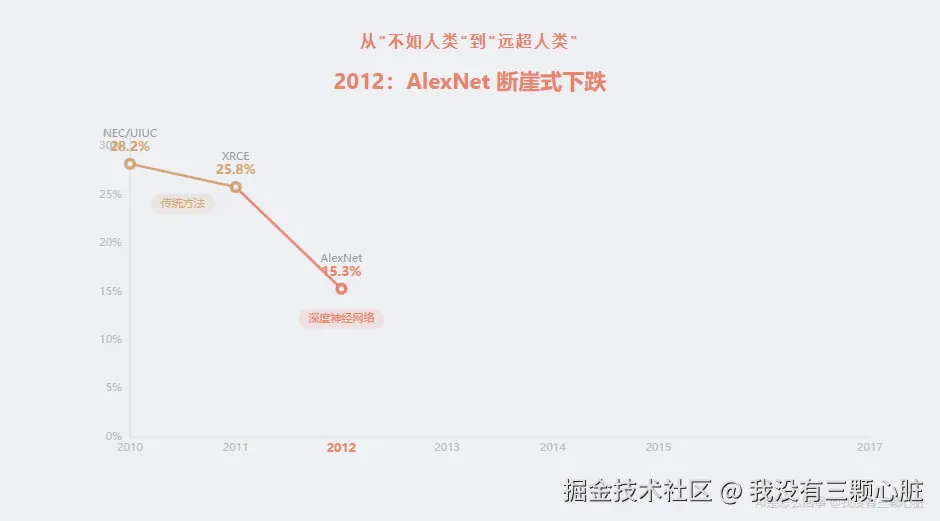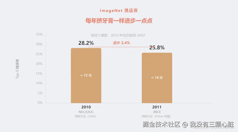 所有人都默认:这就是 AI 进步的速度。2012 年也许能到 24%,2013 年也许能到 22%,像挤牙膏一样。