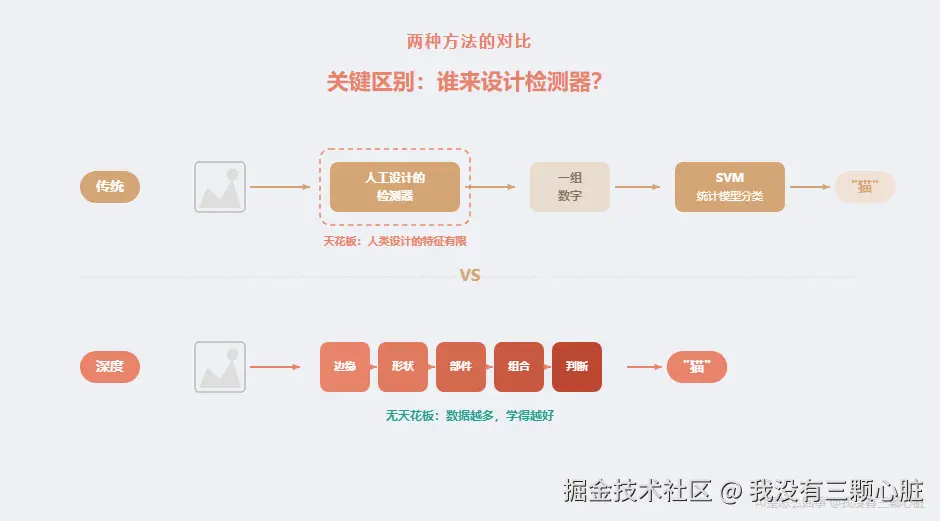 传统方法的流程是这样的:人类先设计一堆固定的检测器("找这种方向的边缘""统计这种纹理出现了几次""计算这块区域的颜色分布"),用这些检测器从图片中提取出一组数字,然后把这组数字交给一个统计模型(比如 SVM,支持向量机)去做最终的分类判断——"这组数字更像猫还是更像狗"。