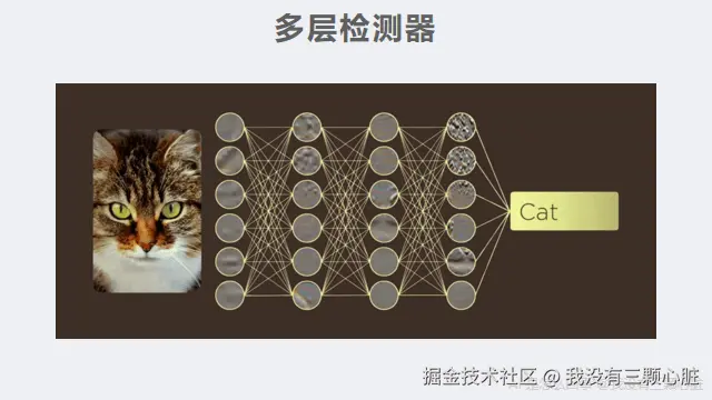 AlexNet 使用的核心方法,在第一篇已经介绍过了——深度卷积神经网络。就是多层检测器叠在一起:第一层找边缘,第二层找形状,第三层找部件,一层一层往上,最后判断"这是什么"。