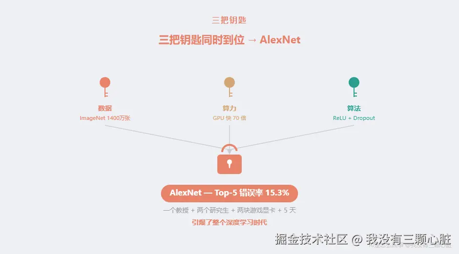 三个要素齐了——数据(ImageNet,1400 万张标注图片,49000 名工人花了两年建成)、算力(GPU,比 CPU 快 70 倍,两块游戏显卡就够)、算法(ReLU、Dropout 等改进,让深层网络终于能训练了)——AI 从此走上了快车道。
