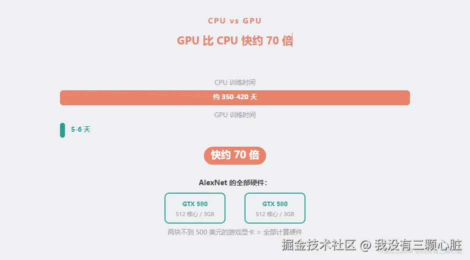 换个角度感受一下:如果用 CPU,同样的训练可能需要几个月到一年多。GPU 把这个时间压缩到了不到一周。两块不到 500 美元的游戏显卡,就是 AlexNet 背后全部的计算硬件。