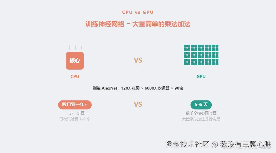 训练神经网络恰好就是这种活——大量简单的乘法和加法,可以同时做。这正是 GPU 的主场。