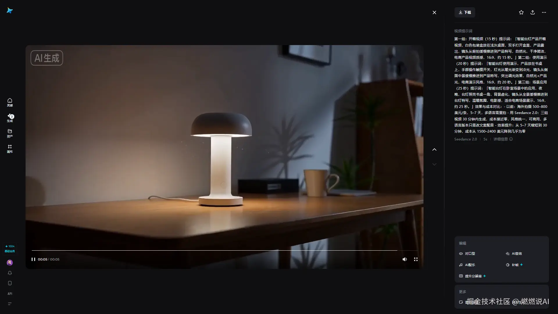 第三组:场景应用(25 秒)提示词:「智能台灯在卧室场景中的应用,夜晚,台灯照亮书桌一角,背景虚化,镜头从全景缓慢推进到台灯特写,温暖氛围,电影感,适合电商场景展示,16:9,约 25 秒。」
