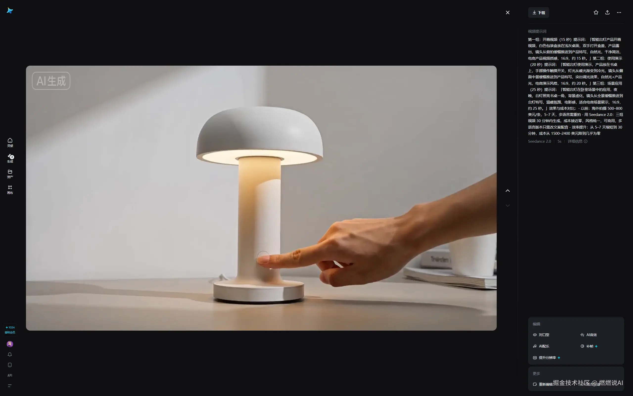 第二组:使用演示(20 秒)提示词:「智能台灯使用演示,产品放在书桌上,手部操作触摸开关,灯光从暖光渐变到冷光,镜头从侧面中景缓慢推进到产品特写,突出调光效果,自然光+产品光,电商演示风格,16:9,约 20 秒。」