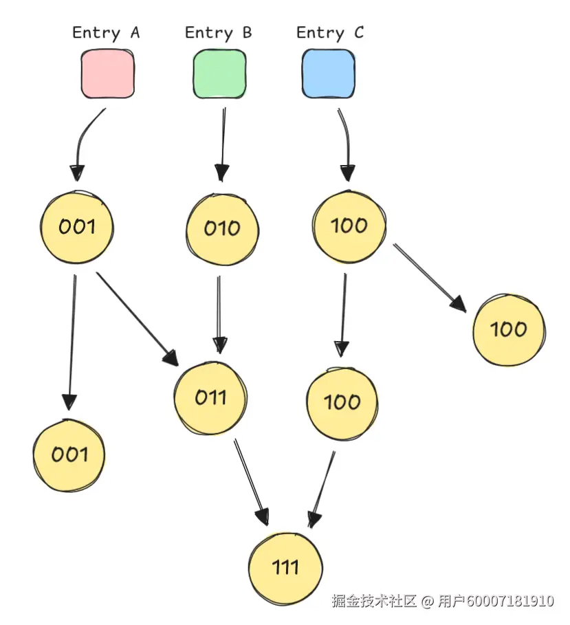 这和打包流程有什么关联呢?在第一阶段,我们为每个入口点分配了唯一的位位置(bit position)。正如力扣(LeetCode)问题中的位掩码代表一组数字那样,Rolldown 中的位字段(bit field)代表的是「能够访问到某个特定模块的所有入口点的集合」。