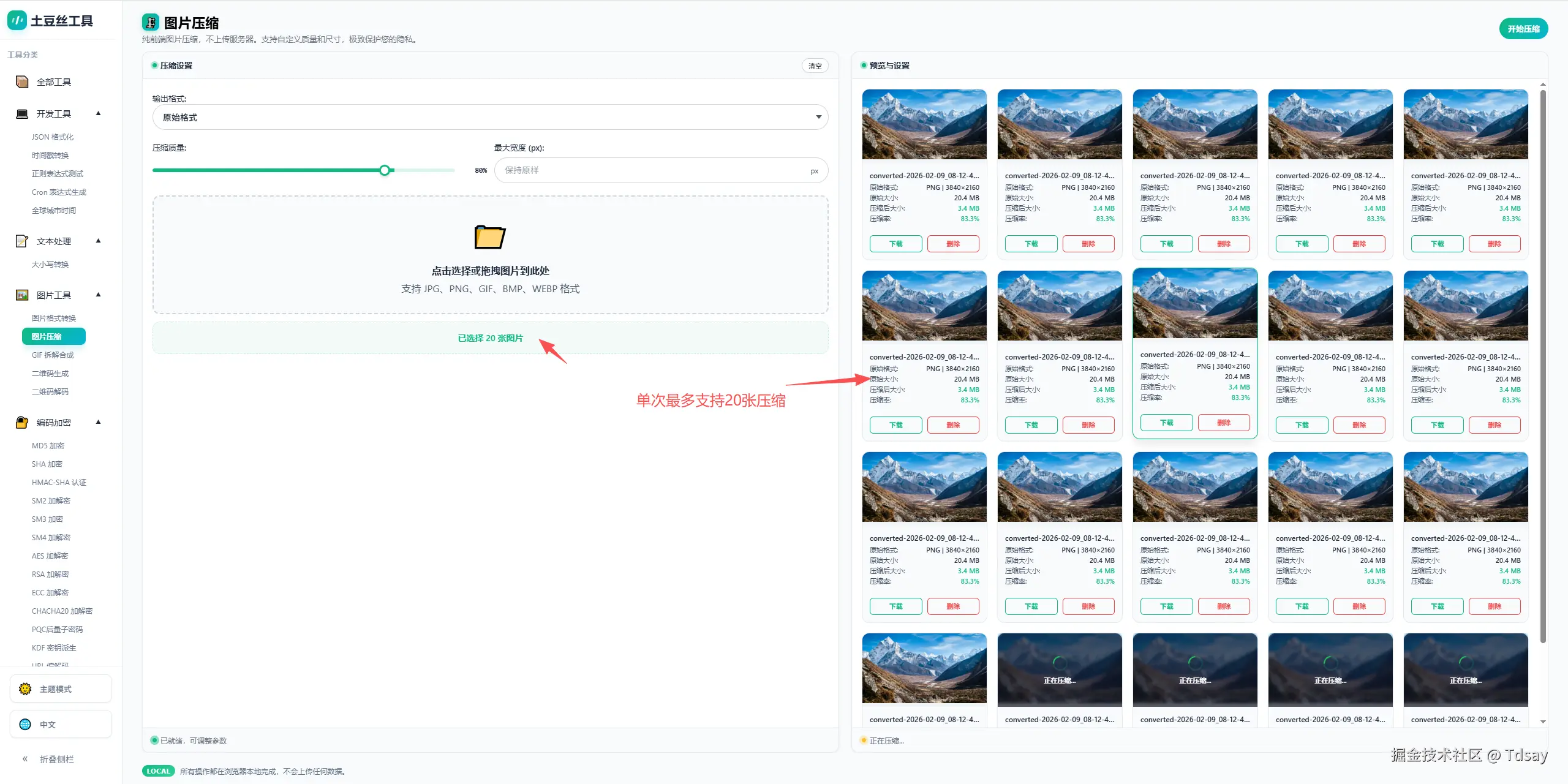 这时候,“批量压缩”就会方便很多,可以一次上传多张图片进行处理,单次最多支持 20 张批量压缩,适合日常集中优化图片体积。