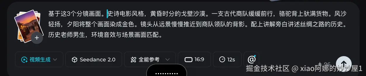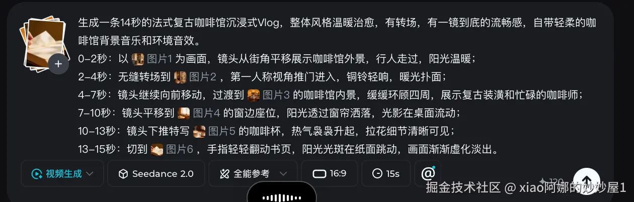 将上一步生成的6张分镜图全部上传至Seedance 2.0的「全能参考」入口,用@指定每张图的用途和出现顺序,让AI生成一条连贯的沉浸式Vlog。