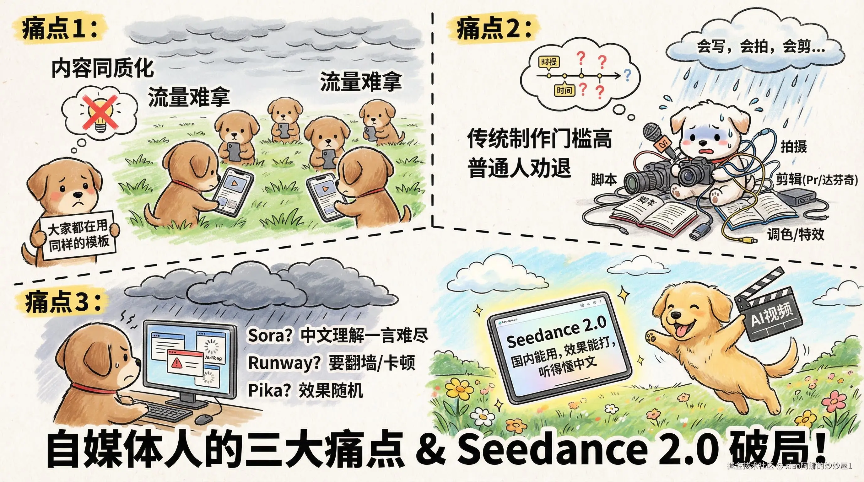所以当Seedance 2.0横空出世的时候,大家才会这么激动——终于有一款国内能用、效果能打、还听得懂中文的AI视频工具了!