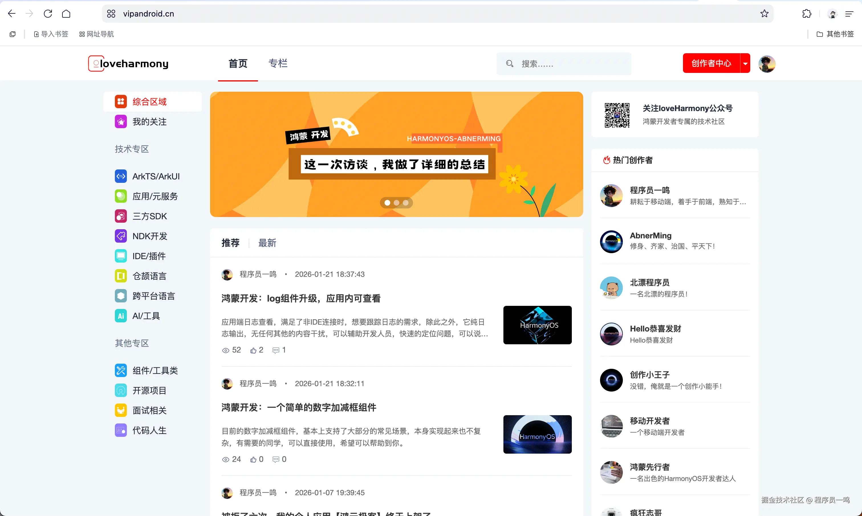 目前自研的鸿蒙开发者平台只有两个板块,文章和专栏,在2026年,会增加问答和开源两个内容板块,当然了,这个纯属自己的爱好,不求有多大的流量,以帮助鸿蒙开发者为主,以自身爱好为辅,域名也已经注册很长时间了,在2026年争取使用上。