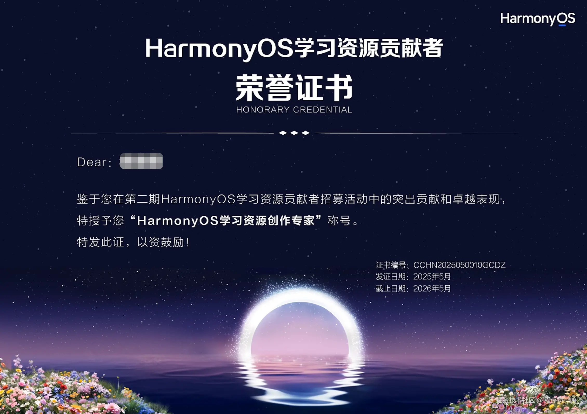 第二个是,在第二期HarmonyOS学习资源贡献中,凭借优质的资源输出得到了一等奖,并荣获了创作专家称号。