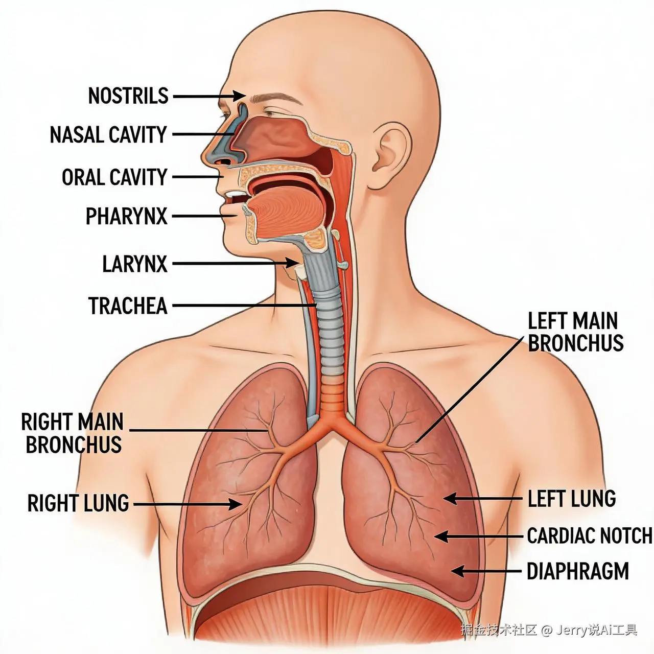人类呼吸系统前视图示意图,显示:鼻腔,鼻孔,口腔,咽,喉,气管,左右主支气管,左右肺和膈肌