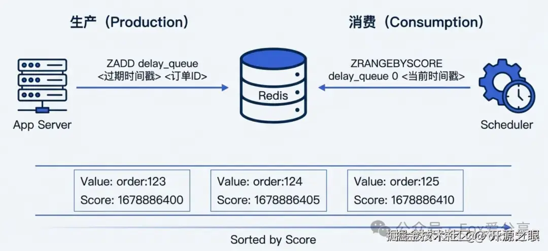 ZADD delay_queue <30分钟后的时间戳> <OrderId> - 消费阶段(轮询) : 启动一个后台线程,每秒从 ZSet 里“捞”数据。我们要找的是