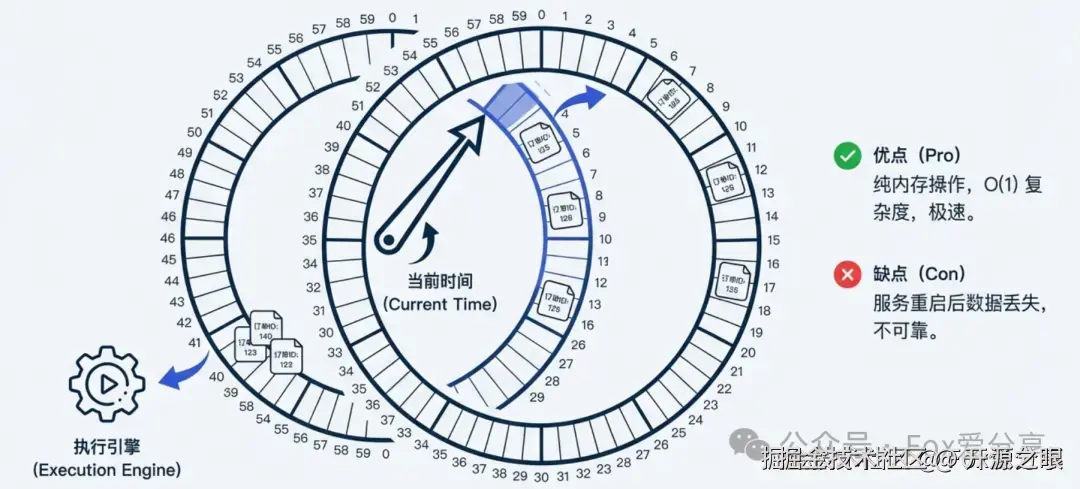 - 逻辑:想象一个钟表,有 60 个格子,指针每秒走一格。订单 30 分钟后过期,就把它挂在“当前格子 + 1800”的那个槽位上。