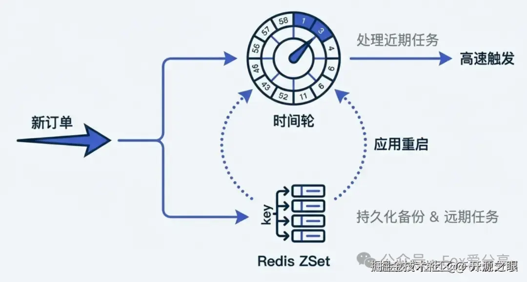 - 大厂实践:通常是用 Redis ZSet 做持久化存储 + 内存时间轮做高频触发。Redis 负责存 1 小时后的任务,应用启动时把近期任务加载到内存时间轮里执行。
