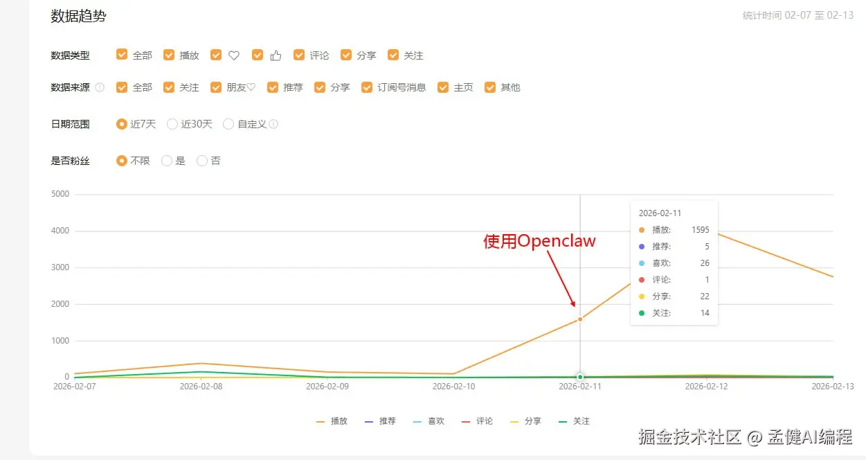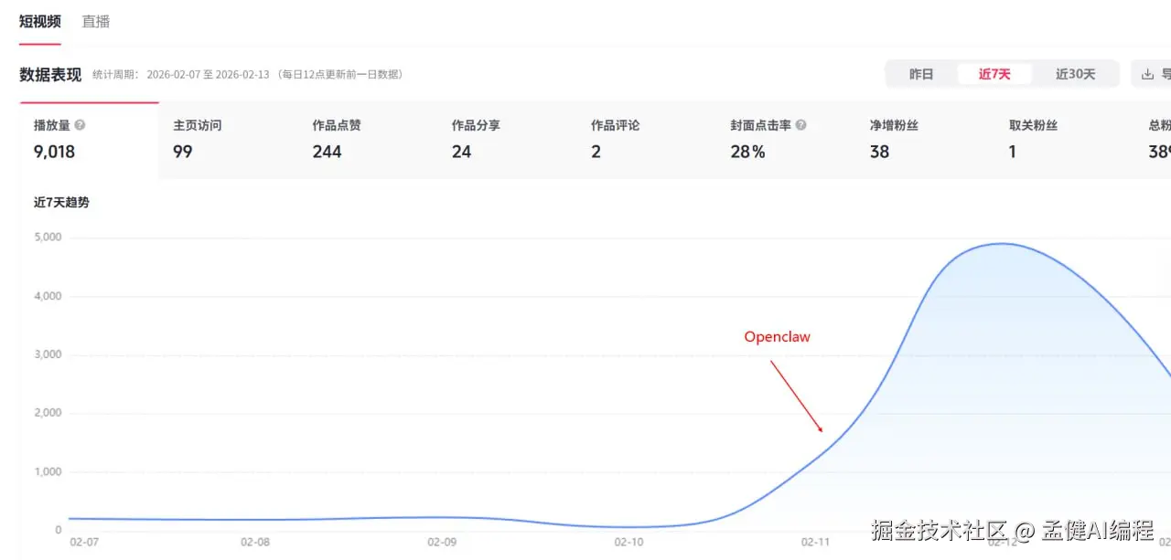 从 02-11 开始用 OpenClaw 做视频的那天起,播放量曲线直接起飞。之前一周加起来可能还不到 1000 播放。