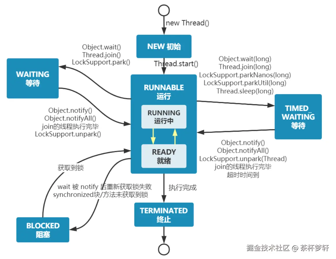 Thread.sleep(ms)/Object.wait(timeout)/Thread.join(timeout)/LockSupport.parkNanos)。 - TERMINATED —