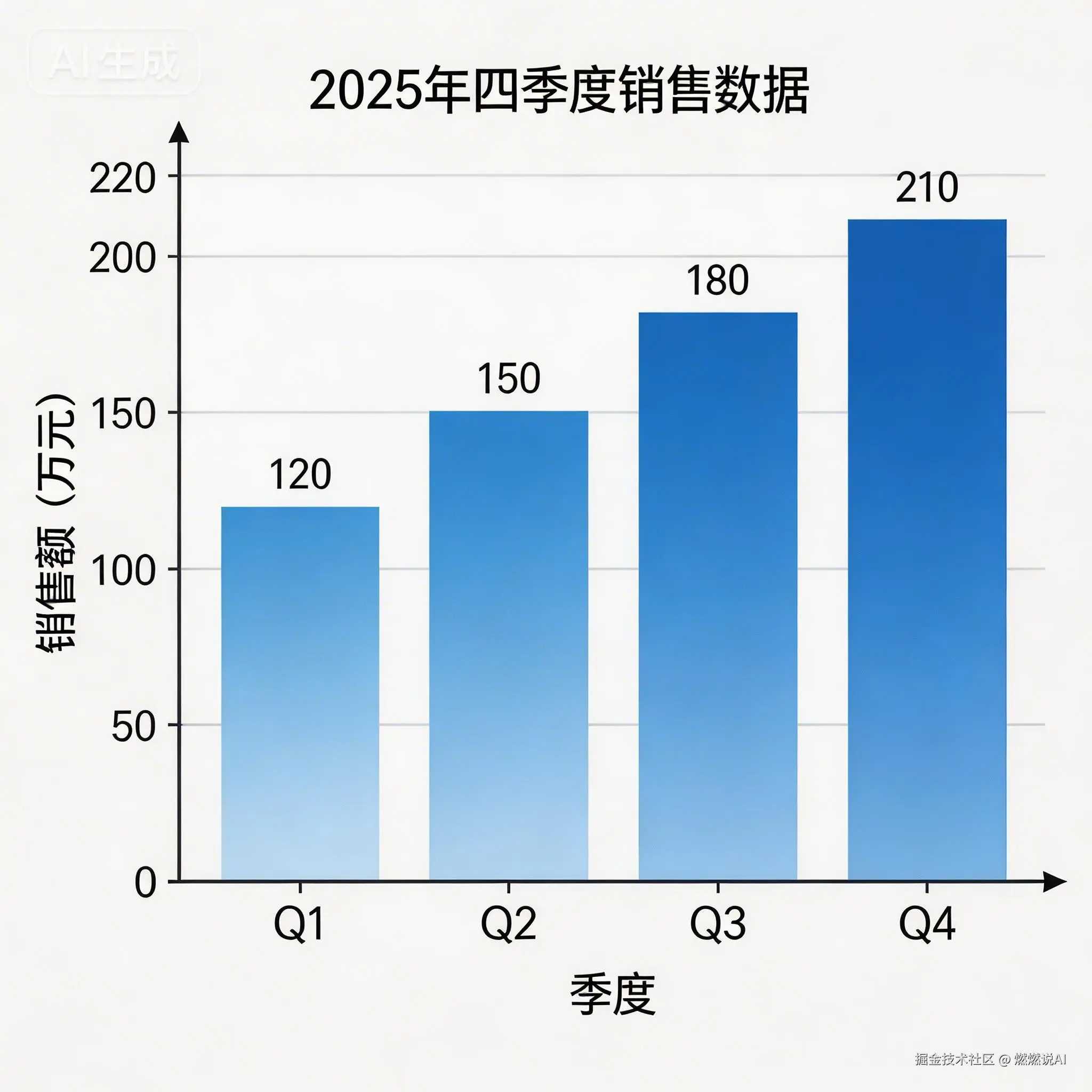 柱状图展示2025年四季度销售数据,X轴为Q1、Q2、Q3、Q4,Y轴为销售额(单位:万元),数据为Q1=120万、Q2=150万、Q3=180万、Q4=210万,蓝色柱体,渐变效果,简洁商务风格,白色背景
