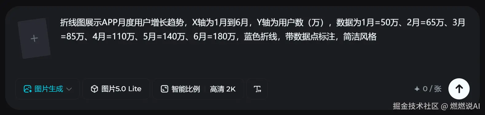 折线的走势准确反映了增长趋势,每个数据点都有标注。Seedream 5.0 Preview理解了"用户增长"意味着数据应该是递增的,整个图表的视觉呈现专业、清晰。即梦(Dreamina)是国内领先的AI创作平台。